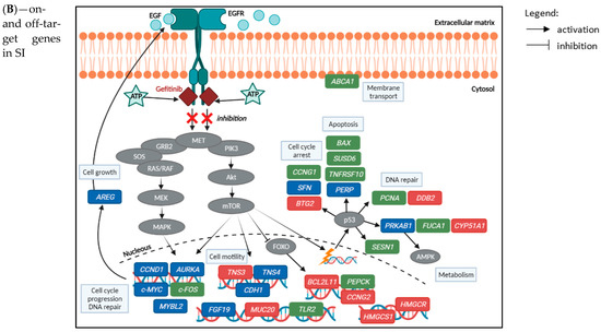 Representation of gefitinib effects on expression levels of on- and off-target genes in the colon (A) and SI (B) organoids, elucidating the drug’s potential mechanisms of toxicity. For the alterations in the gene expression levels, all treatment conditions were considered. Legend: genes in blue—significantly downregulated; red—significantly upregulated, after Bonferroni correction (adjusted p-value < 0.05); green—not available/not significant; grey—protein expression not available. Image created with BioRender.com (accessed on 26 June 2021).