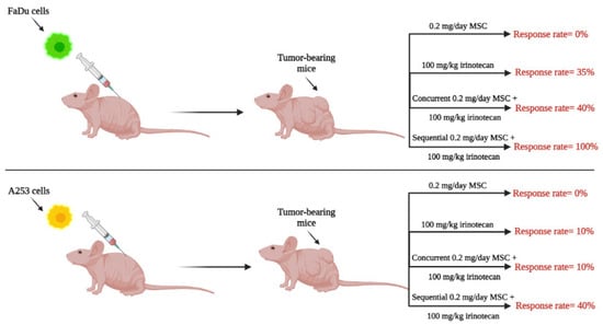 The in vivo response rates of mice bearing tumors treated with 0.2 mg/day MSC, 100 mg/kg irinotecan, concurrently versus sequentially. The concurrent administration of MSC and irinotecan involved administering MSC orally daily for four weeks and irinotecan IV once a week for four weeks, whereas the sequential administration involved administering MSC orally daily for seven days before starting irinotecan, and then starting irinotecan with a weekly dose for four weeks with a daily oral dose of MSC. FaDu and A253 are human squamous cancer cell lines of the head and neck.
