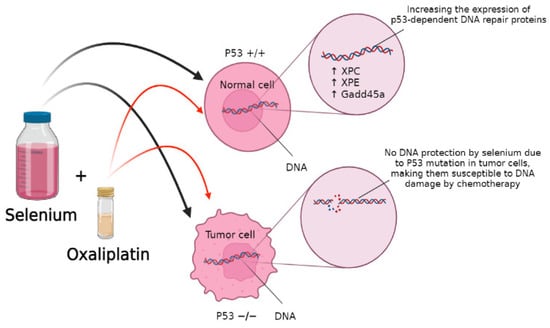 Selenium also helps with DNA repair in response to DNA-damaging agents, which improves the effectiveness of chemotherapeutic agents by protecting normal cells from their toxicity. One study with wild-type (WT) and p53 −/− mouse embryonic fibroblasts (MEF) pre-treated with 10 μmol/L of SLM for 15 h followed by cisplatin or oxaliplatin found that selenium protected WT-MEF from DNA damage in a p53-dependent manner by increasing the expression of p53-dependent DNA repair proteins such as XPC, XPE, and Gadd45a, as shown in the Figure 3. Thus, cells lacking p53, such as tumor cells, did not receive the same protection [46].