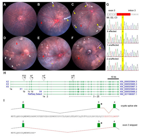 To extend the description of the “central patches” phenotype we reported previously [12], indirect ophthalmoscopy and bright-field fundus imaging with processing in Fiji [34] was performed on presumed homozygous tvrm77 mice, which had been backcrossed with B6 mice for five generations (N5) and intercrossed. The colony was maintained by mating phenotypically affected individuals. Once the causative mutation was identified (see below), mice founded from homozygous progeny of an additional backcross (N6) were also analyzed. Compared to B6 controls (Figure 1A), the eyes of tvrm77 mice exhibited multiple abnormalities, including hypopigmented central patches (white arrowheads, Figure 1C,D), which were sometimes associated with “white-line” lesions (yellow arrowheads, Figure 1B,C,E); numerous small spots distributed across the retina (red arrowheads, Figure 1B–F); and a cloudy white halo or haziness toward the periphery (yellow asterisks, Figure 1E,F). B6 × DBA/2J and B6 × C3A.BLiA-Pde6b+/J mapping crosses based on this aggregate phenotype localized the tvrm77 mutation to a 12 Mbp region of Chr 6. Targeted sequencing of cDNA prepared from whole eye mRNA revealed a deletion of Slc4a5 exon 3 in tvrm77 samples (exon numbering based on RefSeq Select sequence NM_001166067.1). Further sequencing of Slc4a5 genomic DNA identified a T-to-A transversion in intron 3 of tvrm77 mice, likely disrupting a 5’ splice donor sequence (Figure 1G, red box). To confirm the association of this mutation with the mutant phenotype, the Slc4a5 gene was sequenced in five affected mice from the presumed homozygous colony, four affected mice from the mapping intercross, and three unaffected intercross progeny (Figure 1G). A statistically significant association of the homozygous mutation with the affected phenotype was observed (p = 4.5 × 10−3; two-tailed Fisher’s exact test). The full designation for this model is C57BL/6J-Slc4a5tvrm77/Pjn; for simplicity, we retain the original strain designation tvrm77 for the remainder of the paper, and unless otherwise indicated, the genotype is homozygous for the mutant allele.