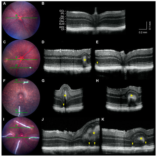 OCT was also performed on the eyes of B6 and tvrm77 mice at 0.9–1.0 months of age, including some of the same eyes assessed by bright-field fundus imaging (Figure 3). Eyes of B6 mice exhibited a normal fundus appearance (Figure 3A) and normal retinal lamination by OCT (Figure 3B, Video S1). Among affected tvrm77 mice, the shortest dot-like white-line lesions (Figure 3C) appeared as a hyperreflective intrusion into the outer retina, with minimal effect on total retinal thickness (Figure 3D, asterisk; Video S2). A thinned outer nuclear layer was detected above the hyperreflective region, and the outer plexiform and inner nuclear layers (OPL and INL, respectively) were distorted above it. A hyporeflective gap was observed at the base of the lesion. Focal RPE thickening was observed near hypopigmented patches, consistent with the OCT appearance of RPE alterations known to accompany retinal neovascular structures [45,46,47]. In longer white-line lesions (Figure 3F,I), a hyperreflective core was observed by OCT (Figure 3G,H,J,K, asterisks; Videos S3 and S4), but the distortion of retinal layers and local increase in total retinal thickness was more pronounced than that associated with dot-like lesions. Focal thickening of the RPE layer was observed in the largest lesions (Figure 3H,J,K, arrowheads), often occurring in the same region as the hypopigmented lesions detected by brightfield fundus imaging (compare Figure 3I,K). In the largest lesions, a thinned ONL appeared both below and above the hyperreflective core along much of its length (Figure 3G,H,J,K, asterisks; Videos S3 and S4), although at some locations, the ONL was interrupted and the hyperreflective core extended from the OPL toward the outer retina (Figure 3K).