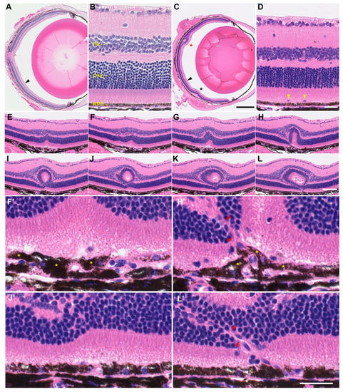 Analysis of serial sections supported the features of white-line lesions as identified by OCT. At the start of the lesion, a small infolding of the ONL was observed above a perturbed RPE region, which included ectopic subretinal nuclei (Figure 5E–G). A more detailed view indicated a focal doubling of the RPE layer and voids in the subretinal space, which may correspond to excess subretinal fluid at this location (Figure 5F′). In a nearby section, an apparent neovascular structure was observed adjacent to a prominent outer retinal fold (Figure 5H,H′). Progressive distortion of the OPL and INL and a focal increase in total retinal thickness were observed as the folds became more pronounced. Subsequent sections exhibited a pseudorosette structure consisting of a thinned layer of photoreceptor nuclei surrounding an eosinophilic region (Figure 5I–L), which was contiguous with the eosinophilic inner and outer segments of photoreceptor cells observed in folds nearer to the lesion start (Figure 5H). The interior of the pseudorosettes included nucleated cells, which may be immune-related, and voids that may correspond to accumulated subretinal fluid. The presence of the pseudorosette structure in 16 consecutive sections suggests that it corresponds to the hyperreflective core and hyporeflective surrounding of white-line lesions observed by OCT. An additional neovascular structure was observed near the end of the collected series of sections (Figure 5L,L′). Taken together, these findings support the interpretation of the white-line lesions as retinal folds and confirm the close association of these lesions with one or more neovascular structures.