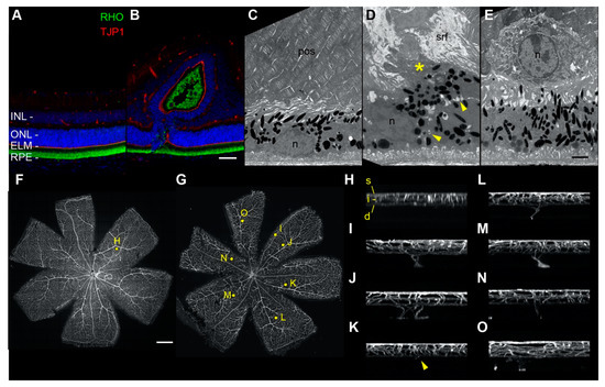 To detect additional features of tvrm77 lesions, we examined fixed ocular tissues by fluorescence and transmission electron microscopy (TEM). Immunofluorescence microscopy of control B6 mice using antibodies against rhodopsin (RHO) revealed photoreceptor outer segments contacting the RPE (Figure 6A, green). Antibodies against tight-junction protein 1 (TJP1) revealed an intact ELM at the outer ONL boundary (Figure 6A, red). An identical arrangement was observed in unaffected regions of tvrm77 eyes (Figure 6B). However, at tvrm77 lesions, RHO staining was limited to the pseudorosette interior, and an intact TJP1 band encircling the interior was observed at the ONL boundary. The preservation of outer segments and ELM suggests that the lesions are created by the infolding of a developmentally intact retina. TEM of B6 eyecups indicated a normal apposition of photoreceptor outer segment with the RPE, which was disrupted in tvrm77 mice by subretinal fluid and debris (Figure 6C,D). Occasional immune cells were observed at the retina–RPE interface, supporting the histological observations (Figure 6E). Flatmounts of B6 retinas stained with isolectin B4 to visualize blood vessels revealed three vascular layers with no evidence of abnormal vascular structures (Figure 6F,H). By contrast, tvrm77 retinas exhibited neovascular structures departing from the deep vascular bed and extending toward the outer retina (Figure 6G,I–O). These results provide further evidence that retinal neovascular structures form in tvrm77 mice.