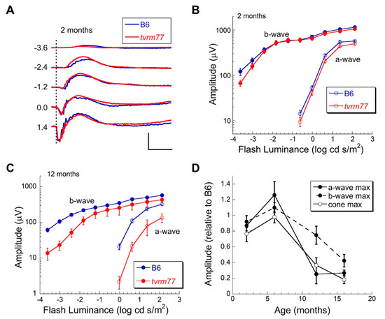 Strobe flash ERG analysis of B6 and tvrm77 mice. (A) Representative ERGs obtained from 2-month-old B6 (blue) and tvrm77 (red) mice exposed to strobe flash stimuli in log cd s m−2 presented to the dark-adapted eye. Calibration bars indicate 100 msec and 500 µV. (B) Luminance–response functions for the major components of the ERG obtained from 2-month-old mice. Data points indicate the mean (±SEM) response amplitude of six B6 and six tvrm77 mice. (C) Luminance–response functions for the major components of the ERG obtained from 12-month-old mice. Data points indicate the mean (±SEM) response amplitude of five B6 and five tvrm77 mice. (D) Response amplitudes of tvrm77 mice plotted relative to B6 controls as a function of age. Responses of tvrm77 mice were comparable to those of B6 mice up to 6 months of age and declined at older ages. Data points indicate mean (±) SEM of 3–15 mice.