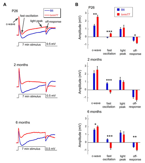 Analysis of the response properties of the RPE. (A) dc-ERG waveforms obtained in response to 7 min duration stimuli of 2.4 log cd m−2 from B6 and tvrm77 mice at 26 days (P26), 2 months, or 6 months of age. Responses of tvrm77 mice have a consistent change where the fast oscillation component remains above the pre-stimulus baseline. Waveforms indicate the average response of 4–10 mice. (B) Amplitude of the major response components of the dc-ERG. Bars indicate the mean (±SEM) response of 4–10 mice and asterisks indicate statistical significance: * p < 0.05 **; p < 0.01; *** p < 0.001.