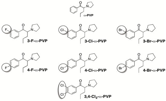 Chemical structure of α-PVP, 3-F-α-PVP, 4-F-α-PVP, 3-Cl-α-PVP, 4-Cl-α-PVP, 3,4-Cl2-α-PVP, 3-Br-α-PVP, and 4-Br-α-PVP.