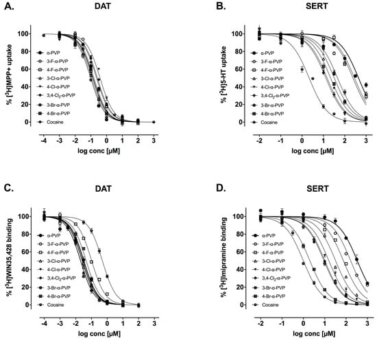 Concentration-effect curves of α-PVP, 3-F-α-PVP, 4-F-α-PVP, 3-Cl-α-PVP, 4-Cl-α-PVP, 3,4-Cl2-α-PVP, 3-Br-α-PVP, 4-Br-α-PVP, and cocaine on [3H]MPP+ uptake and [3H]WIN35,428 binding at DAT (Panel (A,C)) and [3H]5-HT uptake and [3H]Imipramine binding at SERT (Panel (B,D)) in transfected HEK293 cells. Data are expressed as a percentage of control uptake (mean ± SEM) of six independent experiments performed per triplicate.