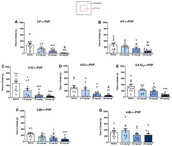 Effects of 3-F-α-PVP (A), 4-F-α-PVP (B), 3-Cl-α-PVP (C), 4-Cl-α-PVP (D), 3,4-Cl2-α-PVP (E), 3-Br-α-PVP (F), and 4-Br-α-PVP (G) (2.5, 10 and 25 mg kg−1, i.p.) on Open Field test (anxiety-like behavior) in CD-1 mice. Bars represent mean ± SEM of time in center. N = 10/group. * p < 0.05 vs. saline and # <0.05 vs. 2.5 mg kg−1. * p < 0.05, ** p < 0.01, and *** p < 0.001 vs. saline, # p < 0.05 vs. 2.5 mg kg−1.