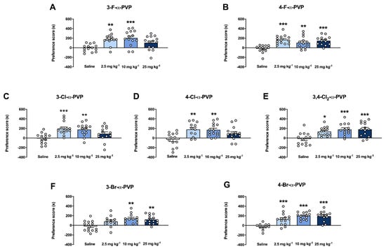 Effects of halogenated α-PVP derivatives on CPP test in CD-1 mice. Bars represent mean ± SEM of the preference score (difference between the time spent in the drug-paired compartment on the test day and the pre-conditioning day). Panel (A) saline, 3-F-α-PVP 10 mg kg−1, and 3-F-α-PVP 25 mg kg−1, N = 14/group and 3-F-α-PVP 2.5 mg kg−1, N = 13/group. Panel (B) saline and 4-F-α-PVP 2.5 mg kg−1, N = 14/group; 4-F-α-PVP 10 mg kg−1 and 4-F-α-PVP 25 mg kg−1, N = 13/group. Panel (C) saline and 3-Cl-α-PVP, N = 14. Panel (D) saline, N = 13/group; 4-Cl-α-PVP 2.5 mg kg−1, N = 12/group, 4-Cl-α-PVP 10 mg kg−1, and 4-Cl-α-PVP 25 mg kg−1, N = 14/group. Panel (E) saline, 3,4-Cl2-α-PVP 2.5 mg kg−1, and 3,4-Cl2-α-PVP 25 mg kg−1, N = 14/group and 3,4-Cl2-α-PVP 10 mg kg−1, N = 13/group. Panel (F) saline and 3-Br-α-PVP 25 mg kg−1, N = 14, 3-Br-α-PVP 2.5 mg kg−1 and 3-Br-α-PVP 10 mg kg−1, N = 12/group. Panel (G) saline, N = 12/group, 4-Br-α-PVP 2.5 mg kg−1 and 4-Br-α-PVP 10 mg kg−1, N = 14/group and 4-Br-α-PVP 25 mg kg−1, N = 13/group. * p < 0.05, ** p < 0.01 and *** p < 0.001 vs. saline.