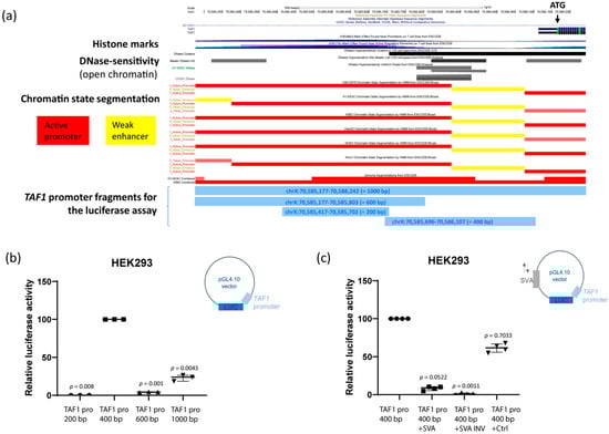 2.5. The SVA Represses TAF1 Promoter Activity In Vitro