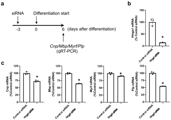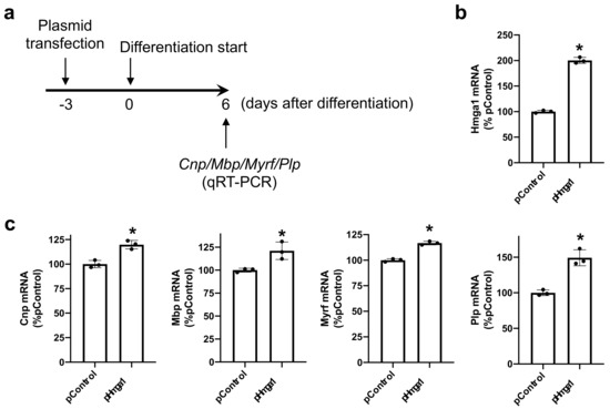 To examine the roles of HMGA1 in OPC differentiation, we then transfected siRNA for HMGA1 into OPC cultures (Figure 2a). This protocol successfully downregulated the mRNA level of Hmga1 when the OPCs were initiated for their differentiation (Figure 2b). On day 6 after the initiation of OPC differentiation, cells with Hmga1 siRNA showed lower mRNA levels of myelin-related genes (Figure 2c). On the contrary, when the OPCs were transfected with the Hmga1-containing plasmid, the mRNA level of Hmga1 was increased (Figure 3a,b), and the mRNA levels of myelin-related genes in the OPCs with Hmga1 plasmid increased slightly but significantly at day 6 after the initiation of OPC differentiation (Figure 3c).
