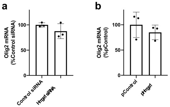 Finally, we also examined whether HMGA1 also participates in the expression of transcription factors that are specifically expressed in oligodendrocyte lineage cells in the brain. Olig2 is one of the major transcription factors that regulate the cell fate of oligodendrocyte lineage cells. Olig2 mRNA was detected in both OPCs and oligodendrocytes in our system, as expected (data not shown). However, a loss-of-function or a gain-of-function experiment demonstrates that HMGA1 may not play a significant contribution to the regulation of Olig2 expression (Figure 4a,b).