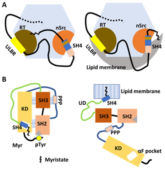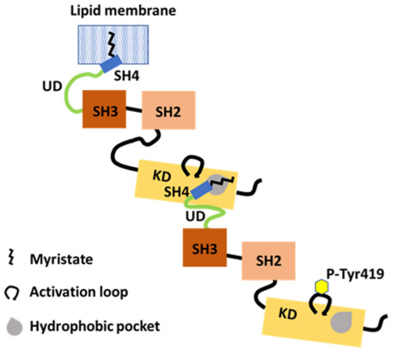 Abl, a Src-related kinase, is myristoylated similarly to Src, but its myristoyl group can interact with the C-lobe of the KD [65,66]. It has been suggested that Src can bind to myristate at the KD site based on crystallographic and NMR studies on structural states of Src constructs lacking SH4 and UD [20].
