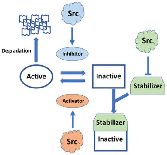 - Piwnica-Worms, H.; Saunders, K.B.; Roberts, T.M.; Smith, A.E.; Cheng, S.H. Tyrosine phosphorylation regulates the biochemical and biological properties of pp60c-src. Cell 1987, 49, 75–82. [Google Scholar] [CrossRef]