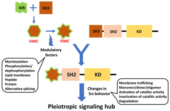 IDRs of SFKs have common (conserved) strategies in the formation of the FIMC of IDR and SH3. However, they have specific sequences responsive to specific inputs. Each SFK receives a specific signal through a specific UD to trigger a specific output through a shared common mechanism integrating disordered domains and structured SH3 domains into FIMCs [21,34,56].