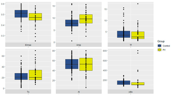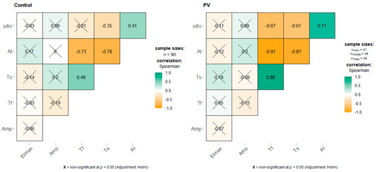 We performed a correlation analysis (Figure 3), which showed a more prominent negative correlation between Tf and γ-dis (ρ = −0.67) in the PV group than in the control (ρ = −0.21)—the latter was statistically insignificant. In both groups, there were positive statistically significant correlations between Tf and Ts (ρ = 0.88 vs. ρ = 0.49), and between AI and ydis (ρ = 0.71 vs. ρ = 0.41), but there were stronger correlations in the PV group.