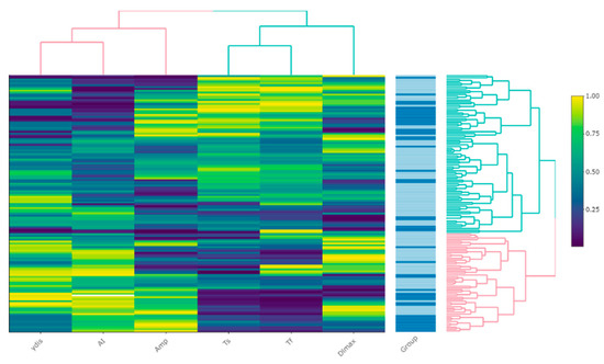 A heatmap of the relative values of RBC morphodynamics parameters expressed as percentiles. The ‘Group’ column represents rows of observations, with darker colors indicating PV patients. The dendrograms represent the process of clustering with color defining major clusters.