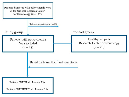 The study lasted from May 2015 to November 2021. In total, 147 patients were diagnosed with PV during this period (according to WHO 2017 criteria) at the National Research Center for Hematology (department of standardization and treatment methods), Moscow, Russia. Furthermore, 48 subjects who agreed to participate in the study were referred to the Research Center of Neurology, Moscow, Russia. All patients were further evaluated for the presence or absence of a stroke according to MRI and anamnesis (Figure 4).