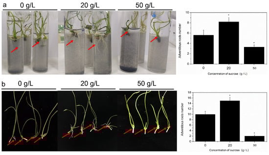 The influence of 20 g/L and 50 g/L sucrose on ARs formation in lotus seedlings. (a) AR formation in the water; (b) AR development in the MS medium (the data of (b) were referred by Cheng et al. 2020 []). (Red arrow represents point of the growth of adventitious root; “*” represents significant difference, p < 0.05.)