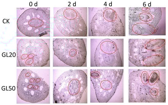 The change in lignin synthesis based on an observation of the microstructure during AR formation in lotus seedlings treated with 20 g/L and 50 g/L sucrose. GL20 represents 20 g/L treatment and GL50 represents 50 g/L treatment. The seedlings were firstly treated with 20 g/L and 50 g/L sucrose, and then transferred into water for continue growth. The hypocotyls at 0 days, 2 days, 4 days, and 6 days after transfer were collected for microstructure observation.