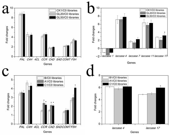 The expression of genes related to lignin synthesis during ARs formation in lotus seedlings. (a) The expression of genes related to monomer lignin synthesis in the GL20 and GL50 libraries. (b) The expression of genes related to polymer lignin synthesis in the C0, CK1, GL20, and GL50 libraries. (c) The expression of genes related to monomer lignin synthesis in the C0, A1, B, and C1 libraries. (d) The expression of genes related to polymer lignin synthesis in the C0, A1, B, and C1 libraries. (“*” represents significant difference at 0.05 level, p < 0.05.)
