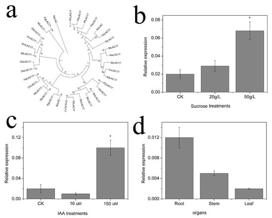 Cloning and expression analysis of NnLAC17 in lotus seedlings. (a) Analysis of the similarity between NnLAC17 and that of other species. (b) Relative expression of NnLAC17 in seedlings treated with 20 g/L and 50 g/L sucrose. (c) Relative expression of NnLAC17 in seedlings treated with 10 µM and 150 µM IAA. (d) Relative expression of NnLAC17 in different organs of lotuses. (“*” represents significant different at 0.05 level, p < 0.05.)