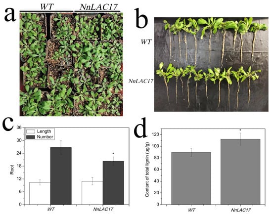 Functional analysis of NnLAC17 in transgenic Arabidopsis thaliana. (a) Phenotypic investigation of NnLAC17 transgenic plants and wild-type plants at 5–6 leaf age. (b) Comparative analysis of root length and number of transgenic plants and wild-type plants. (c) Determination of root length and number in NnLAC17 transgenic plants and wild-type plants (WT). (d) Investigation of polymer lignin in NnLAC17 transgenic plants and wild-type plants. (“*” represents significant difference at 0.05 level, p < 0.05; WT represents non-transgenic plants, and NnLAC17 represents transgenic plants with NnLAC17).