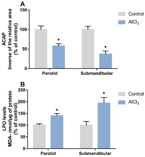 In addition, the lipid peroxidation (LPO) assay was performed, where the levels of the malondialdehyde (MDA) metabolite were measured. Thus, long-term exposure to Al increased the LPO levels in the parotid glands (AlCl3: 140.4 ± 9.01%; control: 100 ± 5.61%, p = 0.0018) and in the submandibular glands (AlCl3: 194.1 ± 23.9%; control: 100 ± 15.89%, p = 0.0187) (Figure 1B).