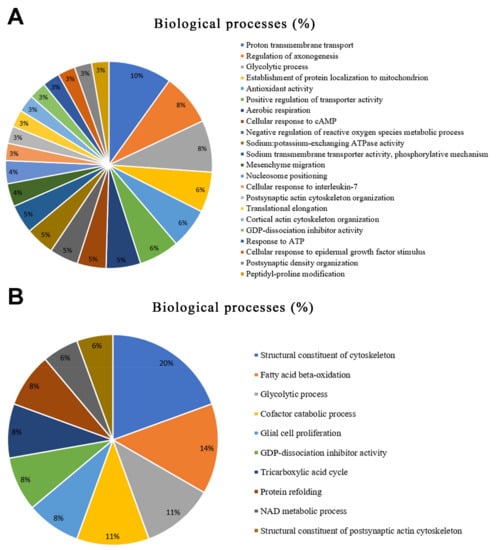 Functional distribution of proteins identified with different expression (A) in the parotid glands and (B) in the submandibular glands of rats exposed to AlCl3 vs. control. Categories of proteins are based on Gene Ontology annotation of the biological process. Protein accession numbers were provided by Uniprot.org, accessed on 11 November 2021. The gene ontology was evaluated according to the ClueGo plugin of Cytoscapes software 3.6.