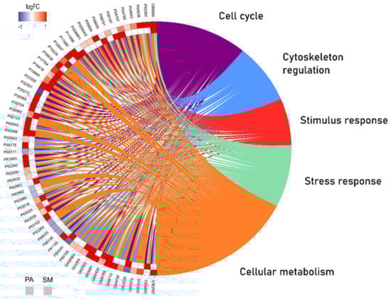 Over-representation analysis (Circos plot) presenting the protein–protein interactions between the aluminum and control groups in both parotid (PA; the outside square) and submandibular (SM; the inner square) glands and the biological processes involved according to Gene Ontology. The altered regulation is expressed according to the colors. Blue represents subexpression, red represents superexpression and white represents absence.