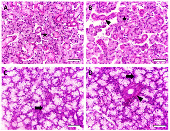 Effects of long-term AlCl3 exposure (8.3 mg/kg/day) on rat salivary glands. Representative photomicrographs of (A) control and (B) aluminum parotid glands and (C) control and (D) aluminum submandibular glands. Stars indicate serous acinus; arrows indicate mucous tubulous and arrowheads indicate ducts. The sections were stained with hematoxylin and eosin (H&E). Scale bar = 50 µm.