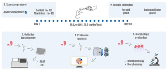From this perspective, this study aimed to investigate the effects of low-dose and long-term exposure to Al, in the salivary glands of rats, as a means of simulating human exposure. Our study evaluated the possibility of oxidative imbalance and its association with the modulation of the proteomic profile and impairments in the morphology of the two main pairs of major salivary glands after chronic Al exposure.