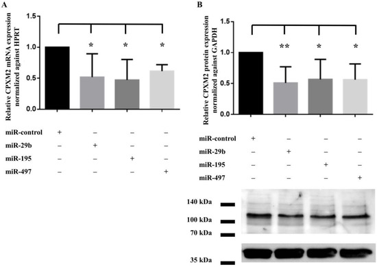 2.3. MiR-29b, mir-195, and miR-497 Suppressed the Expression of CPXM2