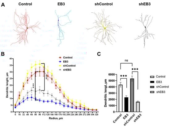 EB3 expression level affects the dendritogenesis of hippocampal neurons. (A) Models of hippocampal neurons transfected with mCherry or co-transfected with mCherry and EB3, plasmid encoding control RNAi (shControl) or RNAi against EB3 (shEB3) at DIV 7−8 and fixed at DIV 15 build in Neuronstudio from confocal images. (B) Dendritic length between two Sholl rings separated by 1 μm radius (distance from the soma) for each group of neurons. (C) The total length of dendrites for each group of neurons, μm. ***: p < 0.001, ns-no statistically significant difference, n = 20 neurons from 4 batches of cultures. Mann–Whitney U test for Sholl analysis, Student`s t-test for dendritic length, normal distribution was checked by the Shapiro-Wilk test.