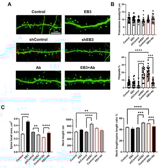 In previous studies, we discovered that EB3 overexpression increases the percent of mushroom dendritic spines and protects them from elimination in hippocampal neurons derived from PS1-M146V-KI mice, modeling Alzheimer’s disease in vitro [23]. These transgenic mice do not have human amyloid precursor protein (APP) nor do they generate human Aβ, and therefore, lack amyloid toxicity, which is thought to be the main pathological hallmark of Alzheimer’s disease. Is the expression of EB3 protein able to protect dendritic spines from amyloid toxicity? To answer this question, we performed the analysis of hippocampal dendritic spines overexpressing EB3 after 72 h incubation with oligomeric Aβ42 fraction in low concentrations [27]. Another important question is the influence of EB3 expression levels on hippocampal dendritic spine shape. The authors and other groups previously showed that downregulation of EB3 leads to elimination of mushroom dendritic spines, while overexpression has the opposite effect [18,23]. Assessing the distribution of dendritic spines among predefined subtypes does not wholly reflect EB3′s role in shaping the spine’s morphology [11]. In order to investigate spine shapes, we co-transfected primary hippocampal neurons with GFP and mouse EB3 expression construct, shEB3, and shControl at DIV 7-8. At DIV 16-17 cultures were fixed, and analysis of dendritic spines morphology was performed by confocal microscopy (Figure 2A). 72 h before fixation, cells were treated with Aβ42 oligomers to model amyloid synaptotoxicity conditions in vitro. Then we performed direct measurement of morphological features describing dendritic spine shapes, including spine head area, neck length, and neck length/spine length ratio on 2D projections of dendritic images with newly developed SpineJ software [41]. This analysis was performed on spines with well-defined heads and necks without diving into thin or mushroom subtypes, since such spines present a continuum of spine shapes rather than distinct subtypes [2,11]. Stubby spines, which don’t have a neck to separate them from the dendrite, present only a minor fraction—less than 3–4%—of all the analyzed spines; therefore, we don’t include them in direct morphometric measurement analysis. Long spines without well-defined heads were labeled as filopodia, which presents a premature spine prototype. They also present a minor fraction—less than 4–5%—in WT neurons. Nevertheless, we analyzed the percent of filopodia due to the reason that shRNAi-based EB3 knockdown and amyloid toxicity leads to a significant increase in filopodia fraction. The density of dendritic protrusion was not significantly affected among all analyzed experimental groups (Figure 2B). In the shEB3 group and in neurons treated with oligomeric Ab, a fraction of filopodia-like protrusions significantly increased (Figure 2B) to 18.26 ± 1.59% (****: p < 0.0001) and 20.12 ± 1.35% (****: p < 0.0001), respectively. We may conclude that both conditions potentiate a formation of immature dendritic protrusions. EB3 overexpression significantly decreases the filopodia fraction to 6.945 ± 0.83% (***: p < 0.0001) to the level comparable with neurons in the control group. Spine head area is known to correlate with the area of the postsynaptic density (PSD), the number of postsynaptic receptors, and the ready-releasable pool of transmitter PSD area [10]. EB3 overexpression leads to a dramatic rise in spine head area, from 0.27 ± 0.01 μm2 to 0.46 ± 0.01 (****: p < 0.0001) μm2 in wild-type neurons and from 0.22 ± 0.01 μm2 to 0.28 ± 0.01 μm2 (****: p < 0.0001) in conditions of amyloid toxicity. In the EB3 knockdown group, spine head area drops to 0.26 ± 0.01, versus 0.30 ± 0.01 μm2 in the shControl group (**: p < 0.01). Spine neck length is tightly linked to its electrical properties, as well as the biochemical and electrical connection between the spine from its neighboring dendrite [10,42,43]. In the EB3 knockdown group, neck length increases to 865 ± 33 nm versus 621 ± 18 nm in the shControl group (****: p < 0.0001). Amyloid toxicity also leads to an increase in the spine neck length to 734 ± 20 nm, in comparison with 623 ± 18 in the control group (**: p < 0.01). Finally, the ratio between the neck length and the total spine length was analyzed in order to show what part of overall spine length falls on the neck. EB3 knockdown and amyloid toxicity leads to an increase in this ratio to 52.2 ± 0.91% (****: p < 0.0001) and 51.06 ± 0.72% (***: p < 0.001), in comparison to 44.20 ± 0.75 in the control group, and 43.28 ± 0.91 in the shControl group. EB3 overexpression in the condition of amyloid toxicity leads to a decrease in neck length/spine length ratio to normal levels (45.61 ± 0.83%, ***: p < 0.001).