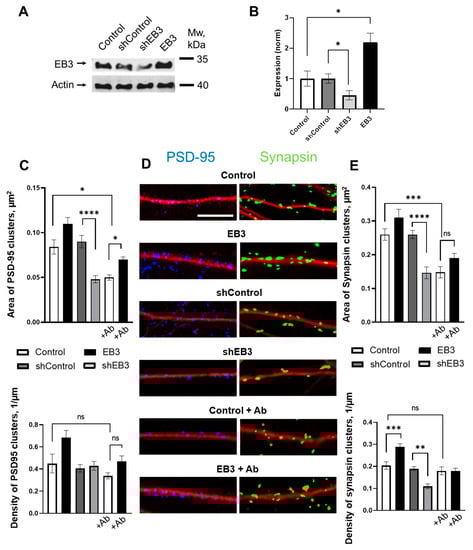 The synapse is a contact between two neurons, serving to transmit information from one cell to another. Most synapses in the brain are formed between the axon of one neuron and the small membranous protrusion from the dendrite—the dendritic spine, of another neuron. Dendritic spines have various shapes and sizes, which are constantly changing in response to neuronal activity and part of synaptic plasticity mechanisms [1,2,3,4]. The vast majority of mature spines have a head and a thin neck, separating them from a dendrite [5,6]. Spine head size is proportional to the area of the postsynaptic density and the number of receptors at postsynapse [7,8,9,10], and therefore reflects the strength of a particular synapse. Spines with the biggest heads are called mushrooms and are thought to be the cellular sites of memory storage [5,11]. It is generally known that the dynamic cytoskeleton of dendritic spines consists of actin filaments [12,13] to enable rapid change of their shape, while microtubules (MTs) are cytoskeleton-organizing components in more stable parts of a neuron, such as axons and dendrites [14,15]. Recent studies revealed that dynamic microtubules, covered by end-binding protein 3 (EB3), enter dendritic spines; this process depends on neuronal activity [16,17,18,19,20] and leads to spines head enlargement [19]. The frequency of MTs’ entry into spines and the number of targeted spines increases after the induction of long-term potentiation (LTP) [19]. Thus, invasions of MTs into spines appear to be involved in the synaptic plasticity mechanisms and cargo transportation [21,22]. EB3 protein is expressed abundantly in the nervous system [16,17,18,19,20], but its role in synapse functioning is still elusive. Previously, it was shown that EB3 potentiates the formation of mushroom dendritic spines in hippocampal neurons and protects them from loss in the PS1-M146V-KI mice model of Alzheimer`s disease [18,23]. The reduction of mushroom spine fractions was shown in PS1-M146V-KI [24], APP-KI [25,26] mice models of Alzheimer`s disease (AD), in conditions of low amyloid toxicity [27], and elimination of mushroom spines has been proposed to underlie the memory loss observed in AD patients [28,29,30]. PS1-M146V-KI mice do not express human amyloid precursor protein (APP) nor generate human beta-amyloid (Aβ); therefore, they do not exhibit amyloid toxicity, which is thought to be the main driving force for AD. In this study, we tested EB3 neuroprotective potential in conditions of low-amyloid toxicity and investigated its role in the determination of dendrites and dendritic spine morphology using direct morphometric measurements. In addition, in this paper, we investigated EB3 expression-level influence on PSD-95, Synapsin protein clustering, and CaMKII-alpha localization. PSD-95 is the key scaffold protein of postsynaptic density in excitatory synapse dendritic spines, where receptors, kinases, other important proteins, and signaling molecules are densely packed to ensure effective signal receiving [31,32]. Immunocytochemistry with anti-PSD-95 antibodies is widely used to label postsynaptic density and investigate synaptic strength [33,34,35,36], since it is required for stabilizing and trafficking N-methyl-D-aspartic acid receptors (NMDARs) and α-amino-3-hydroxy-5-methyl-4-isox-azoleproprionic acid glutamate receptors (AMPARs) to the postsynaptic membrane [32,37]. Synapsin is the synaptic vesicle protein widely used for presynaptic contacts labeling and synapse density investigation [38]. CaMKII-alpha is a major synaptic kinase that is able to translocate to the stimulated spines and postsynaptic densities in response to neuronal activity [39]. Therefore, in this paper, the EB3 protein influence on hippocampal synapses at both pre- and postsynaptic sites using labeling with the most important synaptic proteins was investigated.