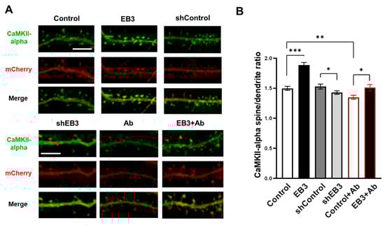 To investigate the localization of CaMKII-alpha, neurons were co-transfected with the plasmid Venus-CaMKII-alpha and mCherry and infected with lentiviruses encoding control RNAi (shControl), RNAi against EB3 (shEB3), or EB3 at DIV 8-9. At DIV 16-17, cultures were fixed, and analysis of fluorescent protein distribution was performed using confocal microscopy (Figure 4A). To assess the CaMKII-alpha spine/dendrite ratio we utilized the approach in [45,46,47]. Briefly, CaMKII intensity in spines and in a segment of the same area in the neighboring dendrite normalized to mCherry intensity, and then the ratio of the normalized CaMKII fluorescence intensity between the spine head and the adjacent dendrite region was calculated. CaMKII-alpha spine/dendrite ratio was 1.49 ± 0.04 in the control group and 1.53 ± 0.04 in the shControl group. Virus-mediated EB3 overexpression increased in the CaMKII-alpha spine/dendrite ratio to 1.88 ± 0.04, which indicates a predominantly synaptic localization of CaMKII (***: p < 0.001). Virus-mediated EB3 knockout and application of oligomeric beta-amyloid reduced the CaMKII-alpha spine/dendrite ratio to 1.43 ±0.03 and 1.35 ± 0.03, correspondingly (*: p < 0.05, **: p < 0.01). Virus-mediated EB3 overexpression restores the CaMKII-alpha spine/dendrite ratio in conditions of beta-amyloid toxicity to 1.51 ± 0.05 (*: p < 0.05).