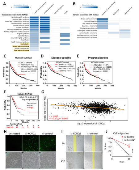 Altered variants and high expression of kcnq1 predict a favorable outcome in LUAD. Associations between KCNQ1 and human diseases (A) and caners (B). The association scores are estimated by calculating a harmonic sum using the weighted vector of data source association scores for all data sources, summarizing all the aggregated evidence for an association. Kaplan–Meier analysis of the overall survival (C), disease-specific survival (D), and progression-free survival (E) in LUAD patients based on altered/unaltered KCNQ1 variant. Kaplan–Meier analysis of the overall survival in LUAD patients based on high/low KCNQ1 expression (F). Pearson correlation coefficient of the expression of KCNQ1 with Ki67 in LUAD tumor tissues (n = 1865) (G). HR, hazard ratio. Representative image of A549 lung cancer cells left untreated or undergoing FAM-labeled siRNAs (si-KCNQ1 and si-control) photographed under a fluorescence microscope 16 h after transfection (H). Representative image at 0 h and 24 h of wound healing assay (I). Quantification histogram (mean ± SD) of three independent experiments representing the area of the scratched ditch determined by the migrated cells (J). *** p < 0.001 between indicated groups.
