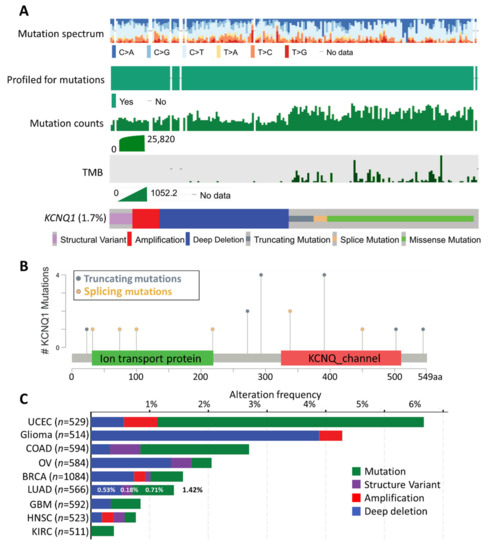 Mutation landscapes of KCNQ1. The mutation spectrum, profiled for mutations, mutation counts, tumor mutational burden (TMB), and genetic alterations of KCNQ1 across all cancer patients (n = 10,395) (A). Schematic illustration number and the distribution of the mutations spanning the 549 amino-acid KCNQ1 sequence (B). The alteration frequency of KCNQ1 in various cancer types (C). BRCA, Breast invasive carcinoma; COAD, Colon adenocarcinoma; GBM, Glioblastoma multiforme; HNSC, Head and neck squamous cell carcinoma; KIRC, Kidney renal clear cell carcinoma; LUAD, Lung adenocarcinoma; OV, Ovarian serous cystadenocarcinoma; UCEC, Uterine corpus endometrial carcinoma.