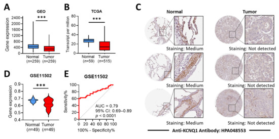 The KCNQ1 expression levels in LUAD tumors and adjacent normal tissue were accessed in TNMplot (https://tnmplot.com/analysis/; GEO datasets accessed on 12 January 2022) [35], in UALCAN (http://ualcan.path.uab.edu/; TCGA datasets accessed on 11 January 2022) [36,37], and in the Gene Expression Omnibus (GEO) (https://www.ncbi.nlm.nih.gov/geo/; GSE11502 datasets accessed on 10 January 2022). The immunohistochemical (IHC) staining signal of KCNQ1 protein expression was analyzed using the Human Protein Atlas (http://www.proteinatlas.org; accessed on 15 January 2022) [38,39,40]. The diagnostic efficiency was evaluated by means of the receiver operating characteristics (ROC) curve analysis. The survival analysis of various clinical stages and in the context of different immune cell contents or tumor mutational burdens was conducted using the Kaplan–Meier plotter web server (available online: https://kmplot.com/analysis/; accessed on 25 October 2021). The pan-cancer profile of KCNQ1 expression was analyzed using the TNM plotter (https://tnmplot.com/analysis/; GEO datasets accessed on 12 January 2022).