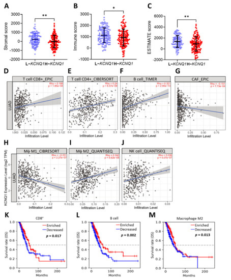 KCNQ1 is closely related to immune infiltration. ESTIMATE analysis of stromal score (A), immune score (B), and ESTIMATE score (C). * p < 0.05, ** p < 0.01 between indicated groups. TIMER analysis of Spearman correlation between the KCNQ1 expression and the infiltration of CD8+ T cells (D), CD4+ T cells (E), B cells (F), cancer associated fibroblasts (CAF) (G), (Mϕ) M1 macrophages (H), (Mϕ) M2 macrophages (I), natural killer (NK) cells (J). Kaplan–Meier analysis based on enriched/decreased content of CD8+ T cells (K), B cells (L), and M2 macrophages (M) in the LUAD cohort.
