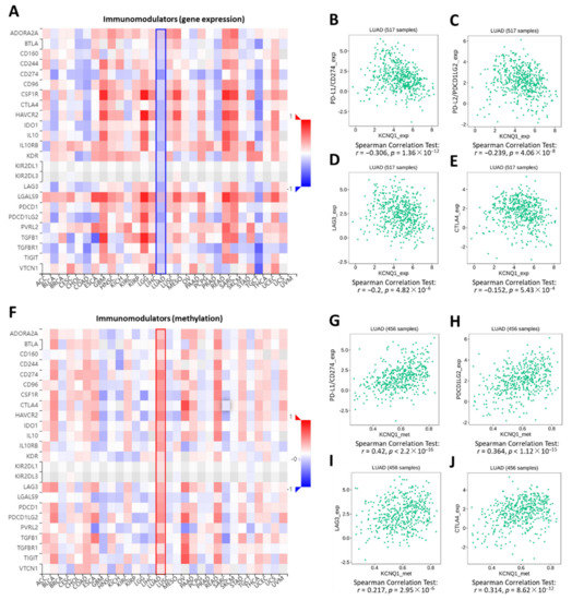 Estimation of STromal and Immune cells in MAlignant Tumor tissues using Expression data (ESTIMATE) analysis was employed to determine the stromal score, immune score, and ESTIMATE score between a high KCNQ1 group and a low KCNQ1 group in a TCGA-LUAD cohort [24]. The high KCNQ1 group a had lower stromal score (p < 0.01), immune score (p < 0.05), and ESTIMATE score (p < 0.01) (Figure 5A–C and Supplementary File S1). Based on the fact that the ESTIMATE score is inversely correlated with tumor purity [24], this result indicates that high KCNQ1 expression is associated with lower tumor purity, thereby influencing the immune status of the tumor microenvironment. Next, TIMER analysis was used to examine the relationship between the KCNQ1 expression and immune infiltration in LUAD. KCNQ1 expression was significantly correlated with CD8+ T cells (r = 0.169, p = 1.85 × 10−4), CD4+ T cells (r = 0.24, p = 6.57 × 10−8), B cells (r = 0.321, p = 2.90 × 10−13), cancer-associated fibroblasts (r = −0.151, p = 7.73 × 10−4), M1 macrophages (r = −0.231, p = 2.27 × 10−7), M2 macrophages (r = 0.242, p = 5.62 × 10−8), and NK cells (r = 0.226, p = 4.07 × 10−7) (Figure 5D–J). We further verified the association between particular immune cell contents and overall survival in LUAD patients by Q-omics analysis. Enriched CD8+ T cells, B cells, and M2 macrophages were associated with a favorable outcome (Figure 5K–M). Specifically, TISIDB analysis revealed that the Spearman correlation coefficients for the majority of the immunomodulators were less than zero, indicating that KCNQ1 expression was negatively correlated with the levels of immunomodulators (Figure 6A), such as PD-L1 (Figure 6B), PD-L2 (Figure 6C), LAG3 (Figure 6D), and CTLA4 (Figure 6E). In addition, we noted that KCNQ1 expression was positively correlated with methylation levels of the immunomodulators (Figure 6F–J), suggesting that epigenetic modification may be implicated in the alteration of immune profiling. Overall, the negative correlation of KCNQ1 with immunomodulator profiling and its simultaneous positive correlation with methylation correlation indicates a close relationship between KCNQ1 and immunomodulators.