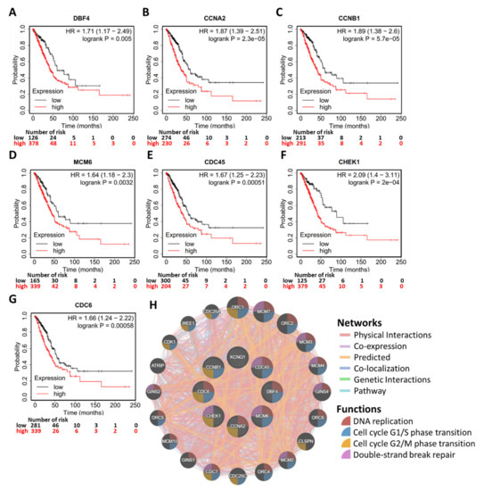 Validation of the clinical relevance of KCNQ1-coexpressed genes and the PPI. Kaplan–Meier survival analysis representing the probability of overall survival based on low/high expression of DBF4 zinc finger (DBF4) (A), cyclin A2 (CCNA2) (B), cyclin B1 (CCNB1) (C), minichromosome maintenance complex component 6 (MCM6) (D), cell division cycle 45 (CDC45) (E), checkpoint kinase 1 (CHEK1) (F), and cell division cycle 6 (CDC6) (G). PPI of KCNQ1 and the seven coexpression genes demonstrating that enriched functions mainly participate in DNA replication, cell cycle G1/S phase transition, cell cycle G2/M phase transition, and double-strand break repair (H).