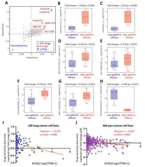 With a view to exploring possible pharmaceutical approaches that could effectively target LUAD, we utilized the Genomics of Drug Sensitivity in Cancer (GDSC) repository of Q-omics analyses to identify drugs that feature potentiation effects in the context of low KCNQ1 expression. We conducted cross-associations between drug response and single-guide RNA (sgRNA)-mediated knockdown of KCNQ1 using a CRISPR approach in LUAD cell groups. Among 471 drugs, 7 drugs exerting altered potency were identified (Figure 10A and Supplementary File S4). LUAD cells with high sgRNA-GDF15 efficiency exhibited higher log(IC50) values in response to lapatinib (Figure 10B), erlotinib (Figure 10C), ABT737 (Figure 10D), RO-3306 (Figure 10E), foretinib (Figure 10F), and AMG-319 (Figure 10G). In contrast, pyrimethamine showed an inverse effect (Figure 10H). Furthermore, we employed a Cancer Cell Line Encyclopedia (CCLE) analysis to further verify the effect of KCNQ1 expression levels on drug sensitivity in cancer cell lines. The drug sensitivity of lapatinib showed a negative correlation with KCNQ1 expression in 100 lung cancer cell lines (r = −0.272, p value = 0.006) (Figure 10I and Supplementary File S5) as well as 464 pan-cancer cell lines (r = −0.187, p value < 0.001) (Figure 10J and Supplementary File S6).