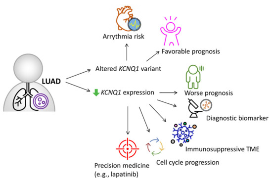 KCNQ1 is curated as one of the definitive genes for arrythmia [26], while its clinical implications and biological roles in LUAD remain unclear. In this study, we integrated multi-omics databases and experimental investigation to reveal KCNQ1 as an independent risk predictor and as a diagnostic biomarker for LUAD. KCNQ1 with altered variants had associations with favorable prognosis, while its low expression predicted worse prognosis and negatively correlated with tumor proliferation indicator Ki67. The KCNQ1 mutations were highly associated with TMB. The decreased gene/protein expression of KCNQ1 can serve as a diagnostic biomarker and show good diagnostic efficiency. The KCNQ1 expression preferentially showed prognostic value in the early stage of LUAD. On the other hand, we uncovered that the content of Th1, Th2, macrophages, NKT, MSC, and TMB can counteract the prognostic significance. Low KCNQ1 is closely associated with decreased immune infiltration of CD8+ T cells, B cells, and M2 macrophages, which indicated shorter overall survival among the LUAD cohort. Specifically, KCNQ1 expression negatively correlated with the levels of immunosuppressive molecules, wherein methylation modification may play a role. The potential mechanism of KCNQ1 underlying LUAD progression may lie in the perturbation of genes relevant to the cell cycle and DNA replication. In addition, we showed that the diagnostic and prognostic value of KCNQ1 can be extrapolated to other cancer types, including KIRC, PCPG, and COAD. Importantly, we identified that lapatinib can act as a therapeutic option when LUAD presents with low KCNQ1 expression, offering a promising precision treatment strategy. A proposed model is summarized in Figure 11.