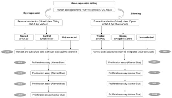 We initially used the STRING server (https://string-db.org/, (accessed on 23 December 2021)) to define HOXB9 functional partners and further explore its potential action. For gene-expression-editing studies, the human HCT116 colon adenocarcinoma cell line was obtained from the American Type Culture Collection (ATCC, Manassas, VA, USA) []. The plasmid vectors (OriGene, Köln, Germany), pCMV6-AC-HOXB9-GFP (RG213735), and pCMV6-AC-GFP (PS100010) were used as HOXB9, thereby overexpressing negative control vectors, respectively. For HOXB9 gene silencing, the Silencer® Select small interfering RNA (siRNA) (Life Technologies, Loughborough, UK) against HOXB9 was used. The non-targeting Silencer® Select siRNA#1 was used as a negative control. The overexpression and knockdown of HOXB9 efficiency were evaluated at the mRNA and protein levels using RT-qPCR and Western blotting, respectively. The outcomes were cell proliferation and fold-change in the RNA expression of EMT markers between the HOXB9 overexpressing cell group and the control group (VIM, CDH1, CDH2, ZEB1, ZEB2, SNAI1, SNAI2, TWIST) []. Cell proliferation was assessed using the Alamar Blue proliferation assay for up to 120 h post-transfection [,]. A detailed methodology of the in vitro studies is provided in Supplementary Digital Content 1.doc (Supplementary Material S1) and the flow chart is shown in Figure 1. The normality of the data was evaluated using the Shapiro–Wilk test. Unpaired two-tailed Student’s t-test (for normally distributed values) or Mann–Whitney test (for non-normally distributed values) was used to compare differences between control and treated groups using GraphPad Prism 8 and SPSS v27.