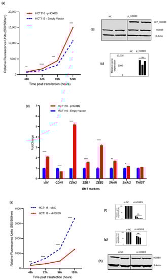 Impact of HOXB9 gene expression modulation on HCT116 cell proliferation and EMT markers expression in vitro. (a) HCT116 cell proliferation measured as relative fluorescence (RFU) after HOXB9 overexpression. Comparison groups were pHOXB9 (overexpressing) and the control group which was transfected with an empty vector. Y-axis represents time points post-transfection, (data derived from 3 biological replicates with 8–12 technical replicates). (b) Western blot evaluation of HOXB9 overexpression in HCT116 cells. In the pHOXB9 group (right) the top band shows the GFP_HOXB9 fusion overexpressed protein, the middle band shows the endogenous HOXB9 protein expression and the bottom band shows the expression of β-actin which was used as a loading control. (c) Histogram showing relative HOXB9 gene expression assessed by RT-qPCR in HCT116 cells from 3 biological replicates in triplicates (ACTB was used as endogenous control gene). (d) RNA fold change expression of EMT-related transcription factors in HCT116 overexpressing HOXB9 vs. control group, (data derived from 3 biological replicates assessed in triplicates). (e) HCT116 cell proliferation measured as relative fluorescence (RFU) after HOXB9 silencing. Comparison groups were siHOXB9 (silenced) and the negative control group (siNC). Y-axis represents time points post-transfection, (data derived from 5 biological replicates with 8–12 technical replicates). (f) Histogram showing the evaluation of HOXB9 % knockdown at mRNA level 24 h post transfection with RT-qPCR using the ΔΔCq method. Y-axis represents the % of the relative gene expression normalised to si-NC samples, the difference between si-NC and si-HOXB9 columns represents the % knockdown efficiency, (data are derived from 5 biological experiments assessed in triplicates). (g) Histogram showing relative % protein expression in the si-HOXB9 samples in relation to si-NC, the difference between si-NC and si-HOXB9 columns represents the % reduction in HOXB9 protein expression 48 h post transfection, β-actin expression was used as a loading control, data derived from 3 biological experiments. (h) Western blot evaluation of HOXB9 silencing in HCT116 cells. The top band shows the HOXB9 protein expression intensity, and the bottom band shows the expression of β-actin which was used as a loading control. Values in (a,d,e) are presented as mean ± standard error of mean (SEM) * p < 0.05, ** p < 0.01, *** p < 0.001, **** p < 0.0001.