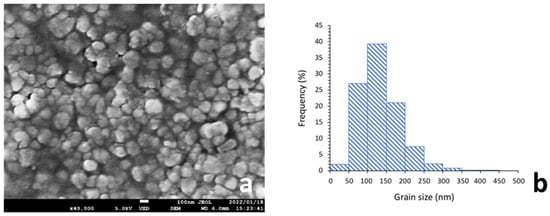 Particle size (40,000× microscopic images) and distribution of zirconia filler at 10 wt.%: (a) Particle size determined by the linear intercept method (average 206 µm) and (b) Minimum 600 grains measured, with the highest size distribution between 100 nm and 150 nm.