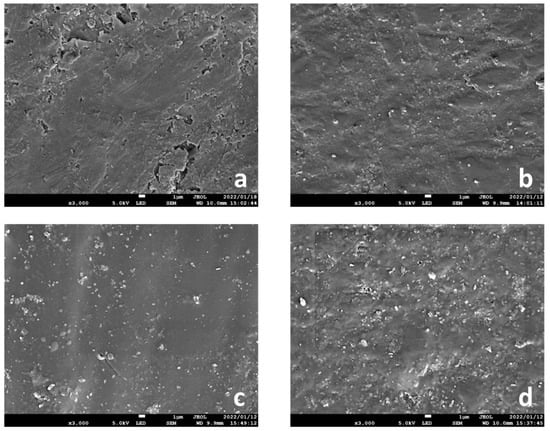 Distribution of zirconia filler under each condition (3000× microscope image). The zirconia filler was uniformly distributed in the photopolymer resin under each condition: (a) 0 wt.% (control), (b) 3 wt.%, (c) 5 wt.%, and (d) 10 wt.%. All images were captured when the printing direction was 0°.