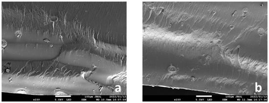 Fracture surfaces (150× microscopic image) of the specimens with (a) 5 wt.% and (b) 10 wt.% zirconia filler in the 0° printing direction observed after the three-point bending tests.